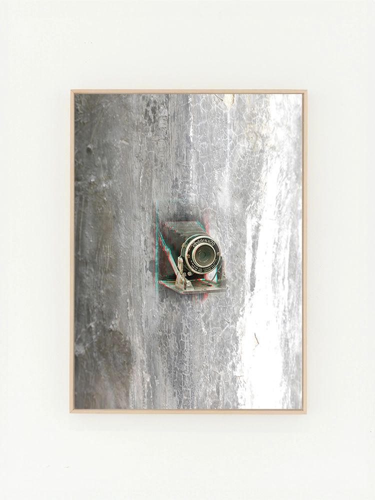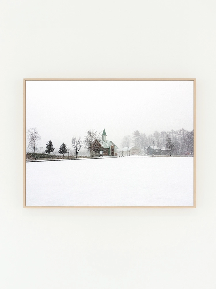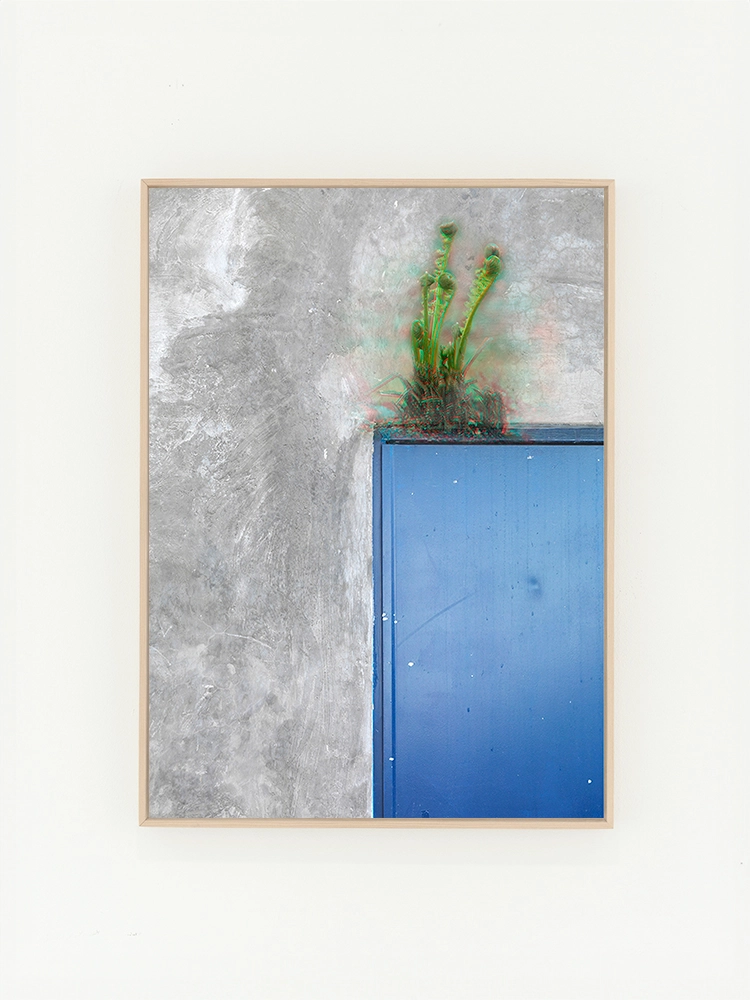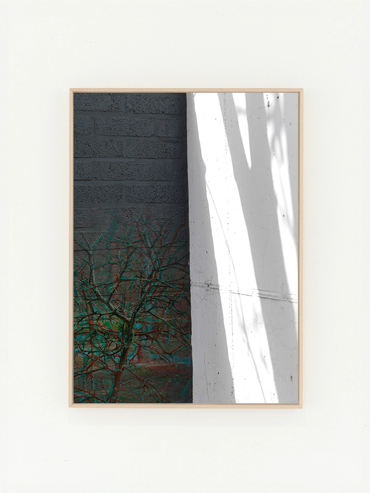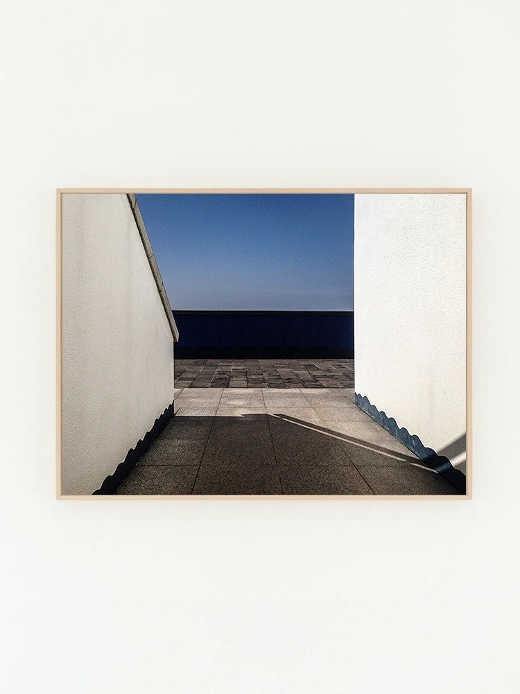 푸른하늘과 벽, 그림자의 기하학적 요소가 결합되어 묘한 분위기의 공간으로 표현된 작품.