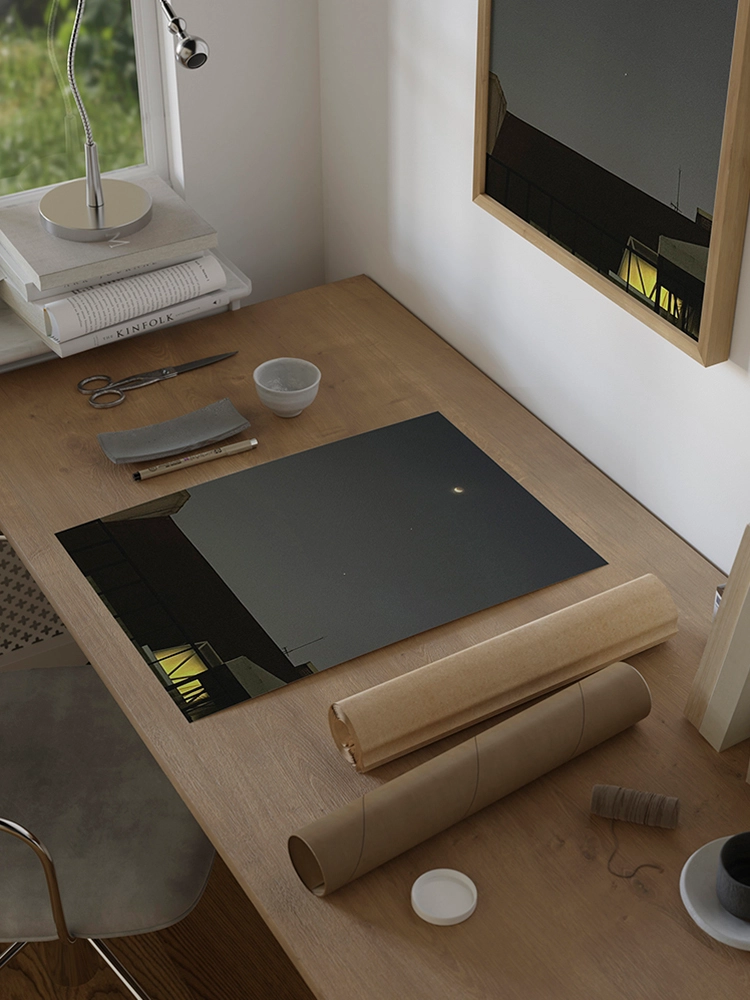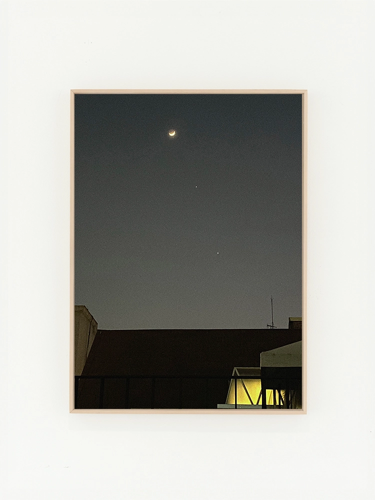 초승달과 두 개의 밝은 별 아래 지붕의 어두운 실루엣과 따뜻하게 붉을 밝힌 창문 하나, 정지된 고요한 저녁시간을 표현한 작품.